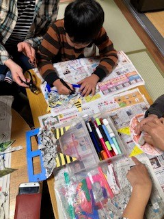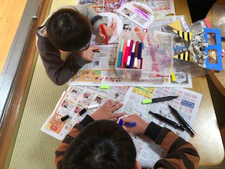 新聞紙を丸めて豆も一生懸命作ってくれています。