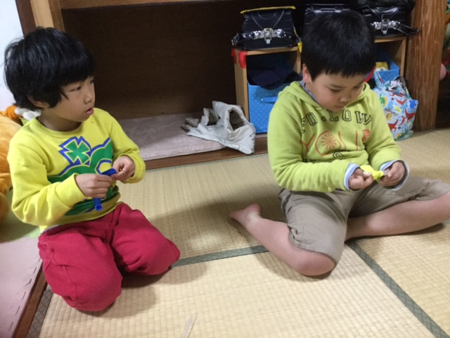 学校も始まりみんないつもの生活に戻りました。まだまだ学校のリズムになれないのか来るとあくびをしたり目をこすったりみんな頑張っています。えいくんは凧を作って公園に飛ばしに行きました。成功したらみんなにも作って飛ばそうと思っています。