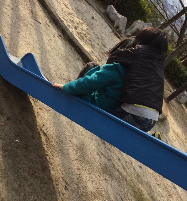 公園では岡村先生と一緒に滑り台です。