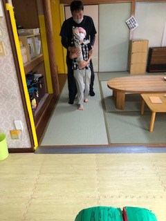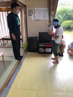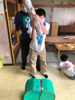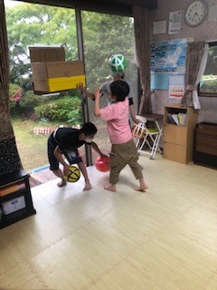 晴れの日は、お庭でミニテニス・サッカーゴール・野球などを行っています。雨の日は室内での運動になりますので、「スイカ割り」をする事にしました。どんな運動もみんな楽しんでいて汗で湯気が出るほどです。