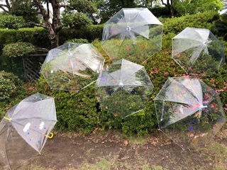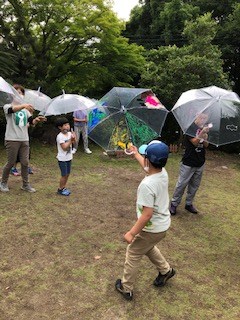 みんなと真剣に楽しんでいました。外に傘を持って自分の傘をさしてみました。