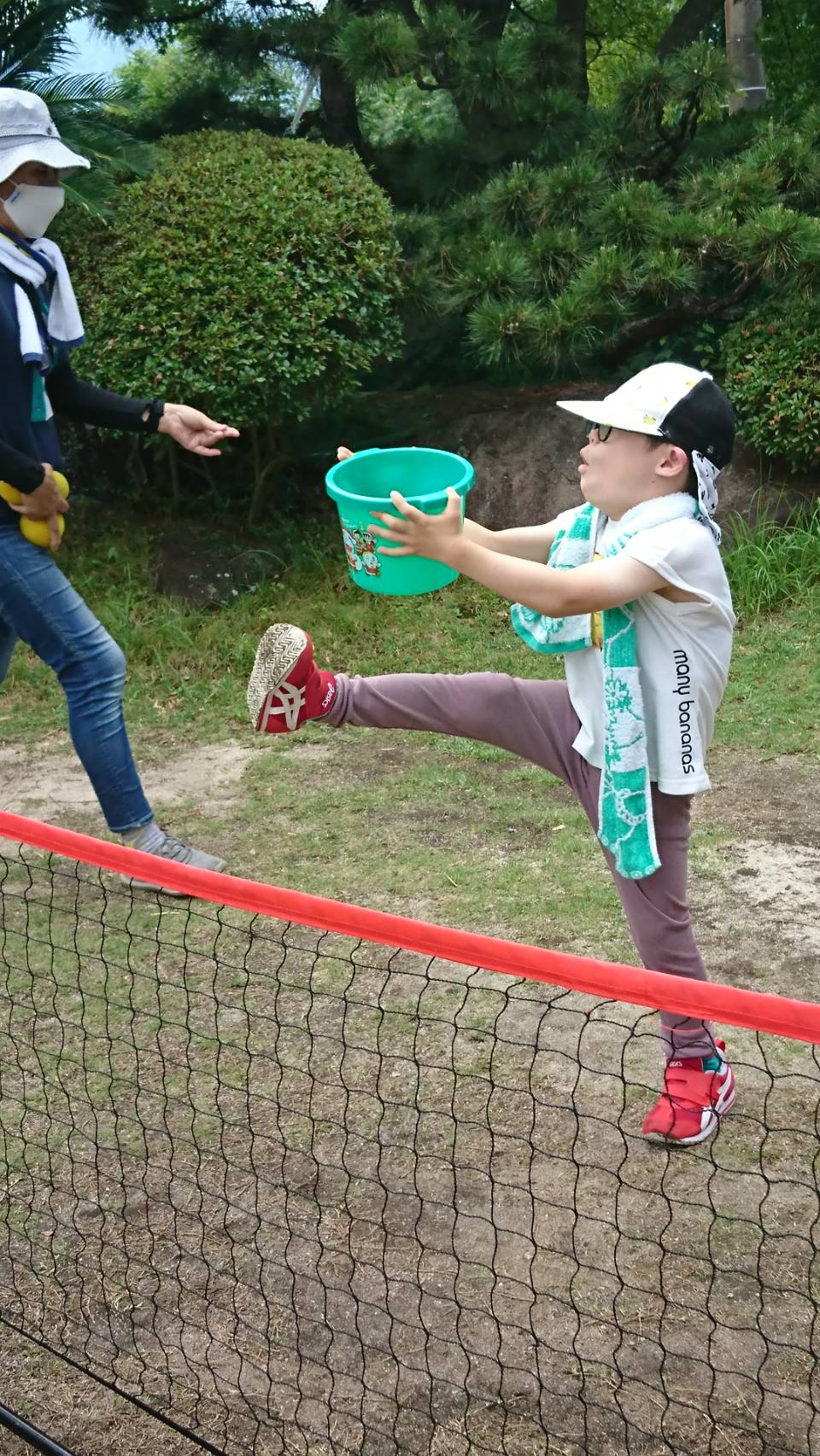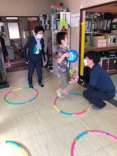 みんな声掛けを聞いて足を動かすことも意識してがんばってキャッチです!(^^)!ボールを使っての運動は足をボールの所にもっていくことが以外に難しいのでバケツを持ってボールをいれることはいろんなところを使うため感覚をつかむのにも役立ちます。