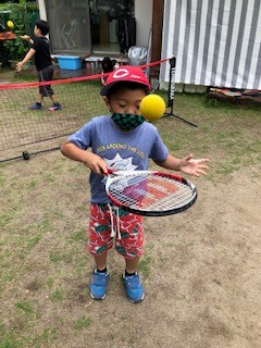 テニスラケットをうまく使ってボールを打てました。テニスだんだんうまくなったから、いつかテニスコートでテニスやりたいねー。先生がちょっぴりテニス上手いのも披露出来たらいいな。