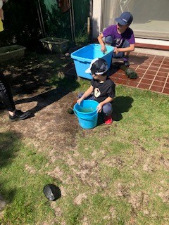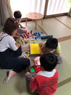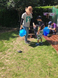 暑い日が続きますがみんな元気いっぱいです。外遊びはミニテニスやサッカーゴールなど球技も取り入れています。みんな汗だくで楽しんでいます。ボールをバケツでキャッチなどみんなとても真剣に楽しく取り組めています(^^♪足を動かして~と声掛けが
